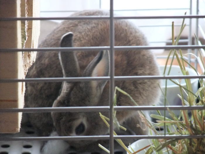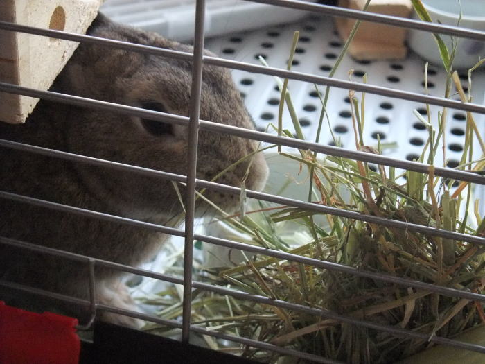 牧草を食べない時はケージの上にぶらさげるとか